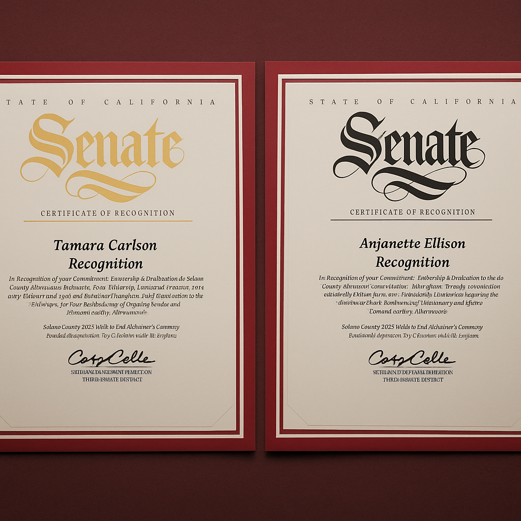 The Watson-Ellison Foundation is proud to announce that Founder Anjanette Ellison and Director Tamara Carlson have been officially recognized by the California State Senate for their outstanding leadership, service, and dedication to families affected by Alzheimer’s disease. The recognition was presented during the Solano County 2025 Walk to End Alzheimer’s Ceremony in Fairfield, California.